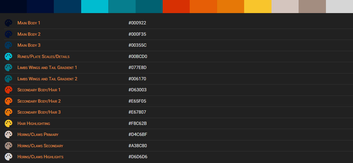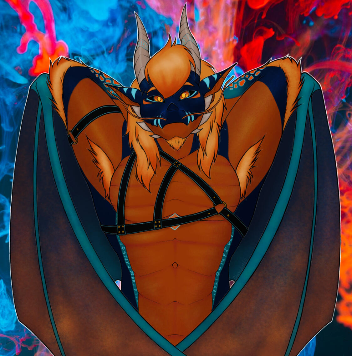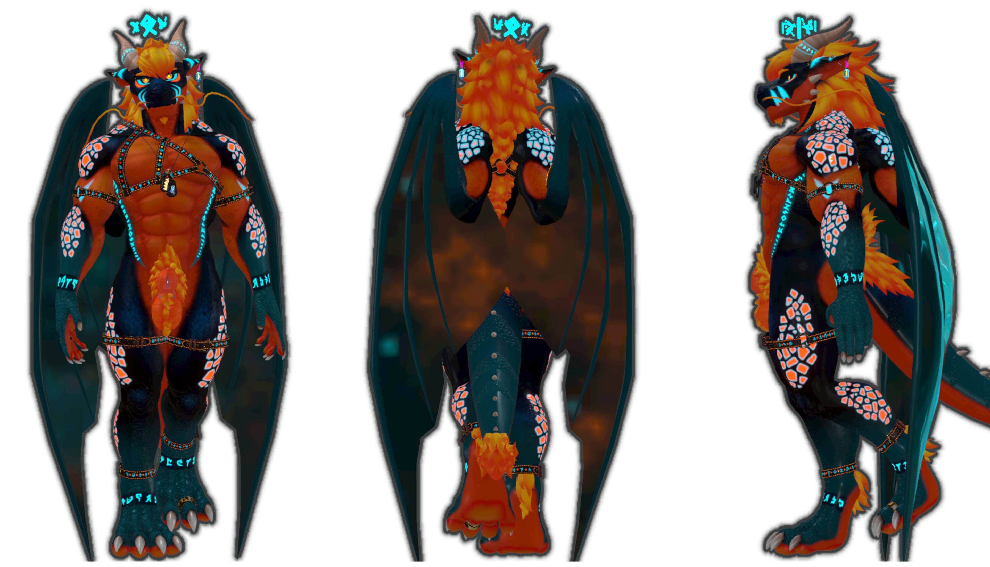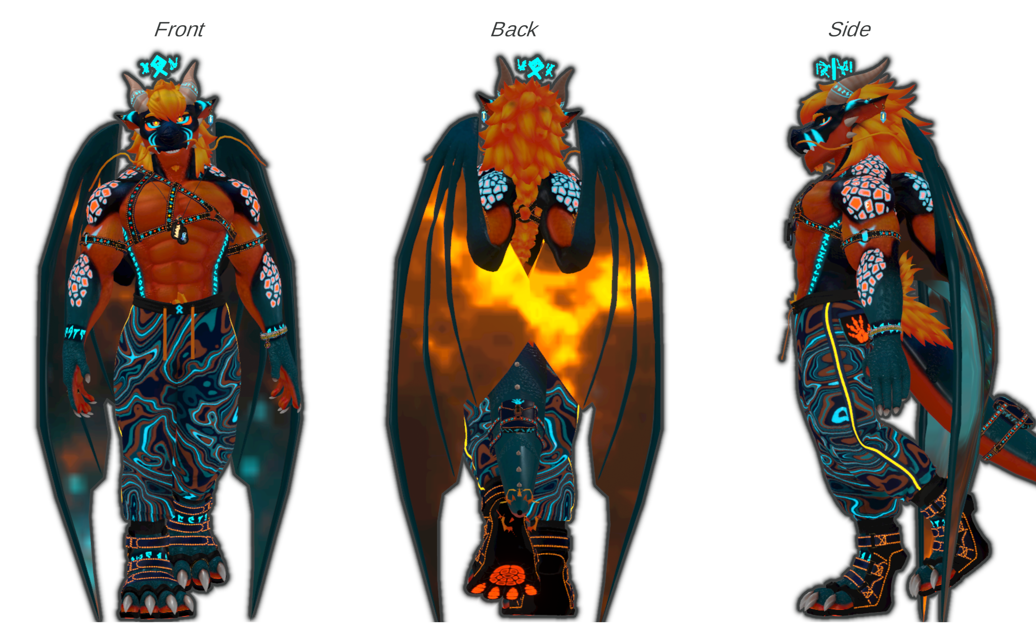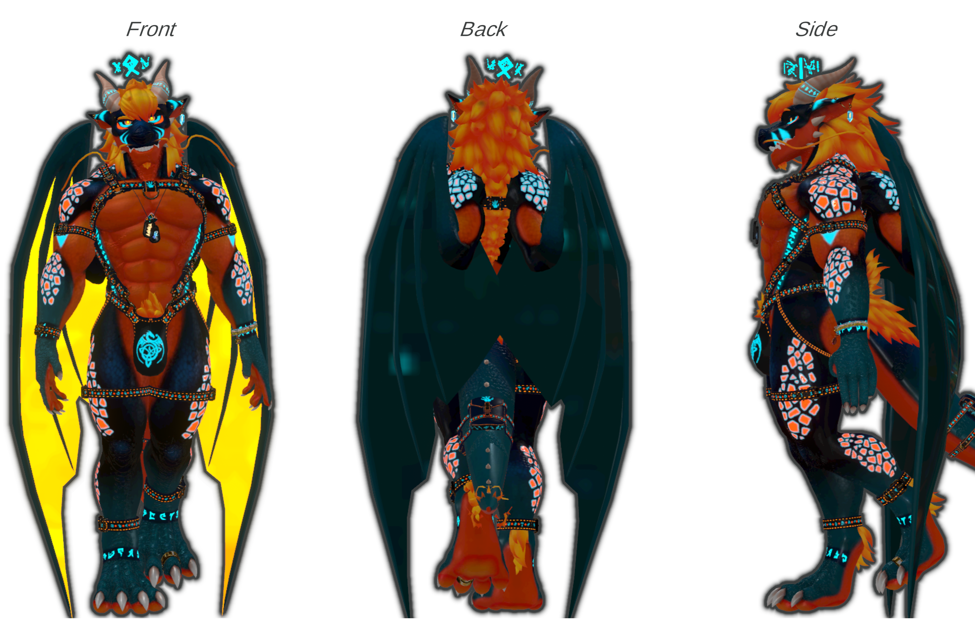 Fluff always present on elbows, ankles, chin, and armpits. Fluff also in groin area that peeks out over the waistbands of pants/shorts and is more prominent when only wearing a jock strap. Runic patterns line both sides of the torso from the base of the pecs down to the groin and curve inward to a point. Large plate scales are two colored and always located on neck/shoulders, forearms, shoulder blades, outer thighs, outer calves, and top of wing musculature.